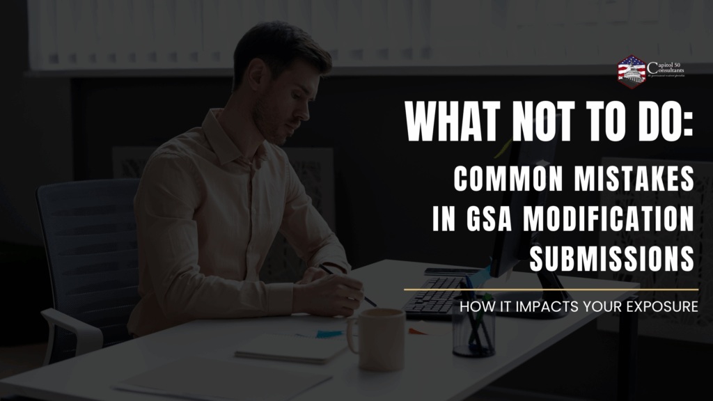 Submitting a modification to your GSA MAS (Multiple Award Schedule) contract may seem mundane—but missteps here can lead to delays, rejections, or even noncompliance exposures. Below are recurring pitfalls that many contractors stumble over (and how to avoid them). 1. Don’t Skip the MAS Modification Guidance Mistake: Failing to review the official GSA modification and mass […]