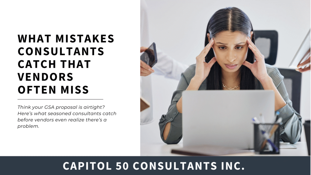 When a vendor tries to go it alone—writing proposals, preparing mods, managing compliance—they often overlook small but fatal flaws. A seasoned GSA contract consultant is trained to spot those blind spots early. Here’s a look at the most common errors consultants catch (or prevent) that vendors frequently miss—and how catching them can save you weeks, dollars, and […]